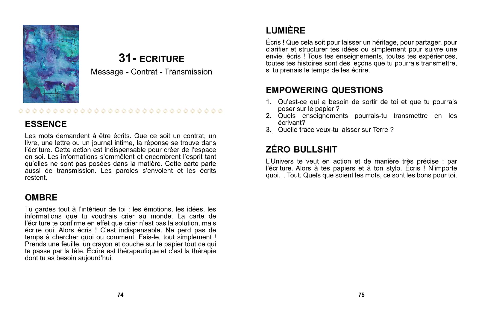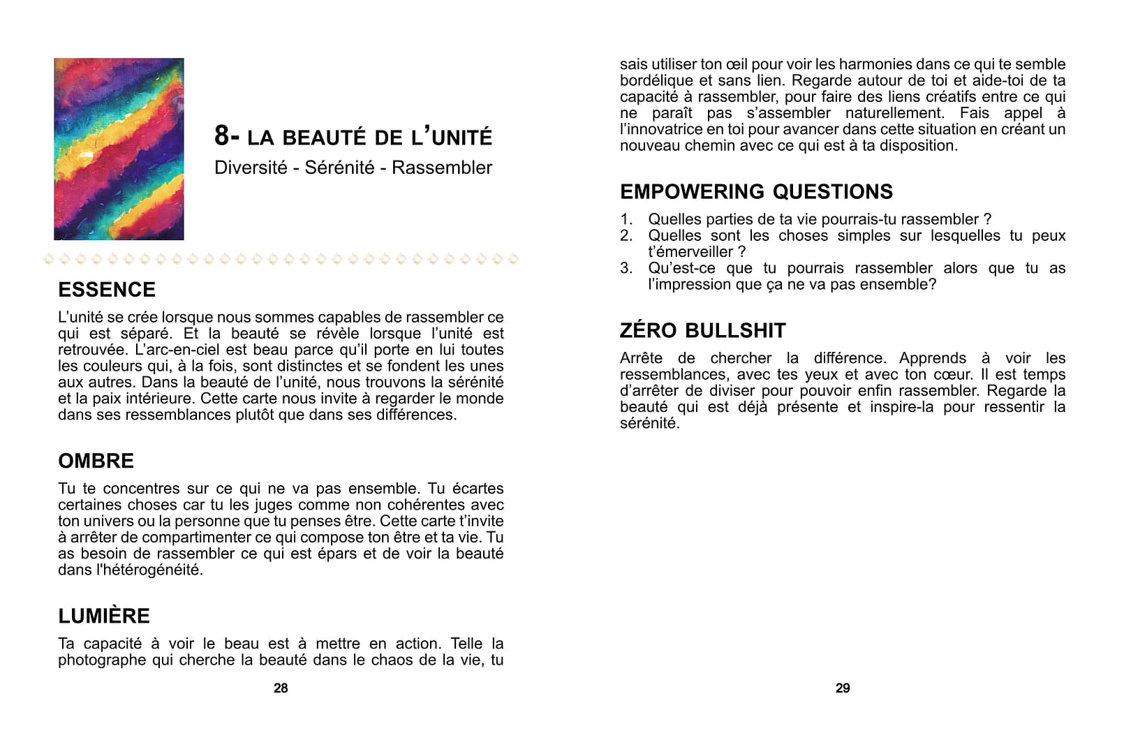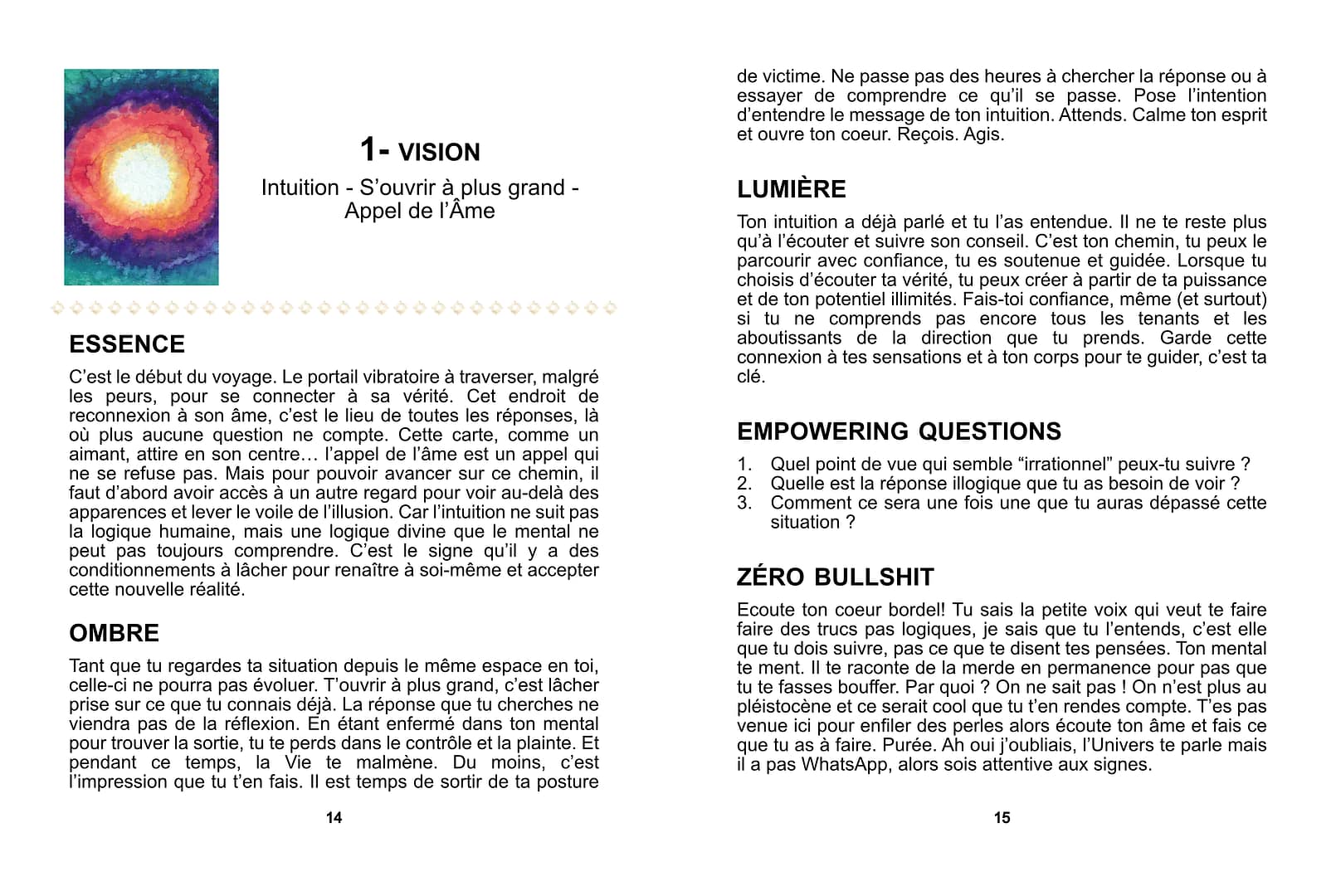 « Les cartes sont encore plus belles que je ne les avais imaginées, et les messages sont juste impressionnants. J’ai l’impression d’avoir été percée à jour, mes peurs, mes doutes, mes valeurs… et les tirages me permettent de ne plus me voiler la face! »